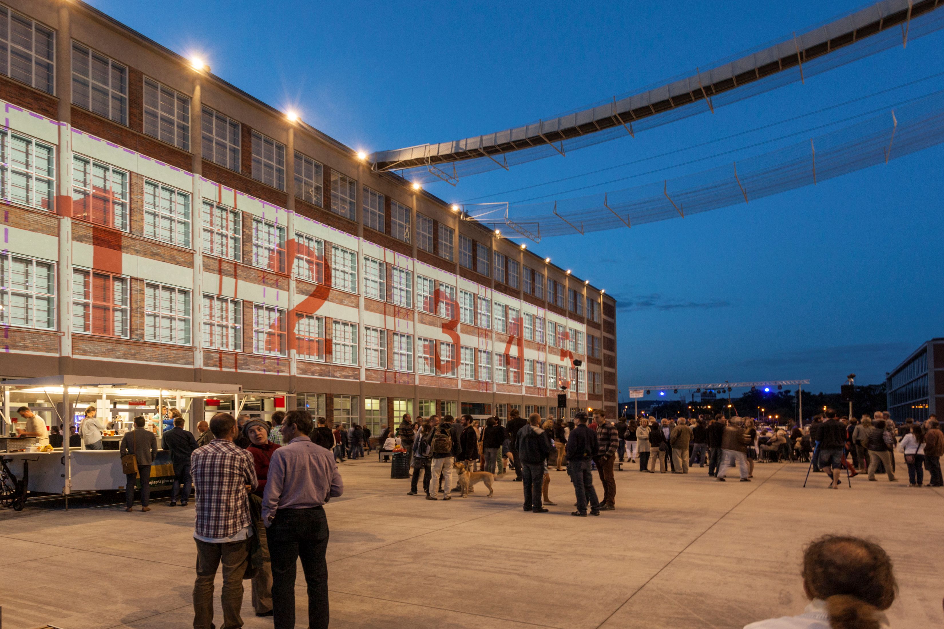 Obě budovy spojuje velká betonová platforma, kde se během roku koná řada koncertů, festivalů a akcí pod širým nebem. A až tu budete, nezapomeňte se podívat nahoru – mezi budovami vedou pásové dopravníky, které sloužily k přepravě materiálů a výrobků.