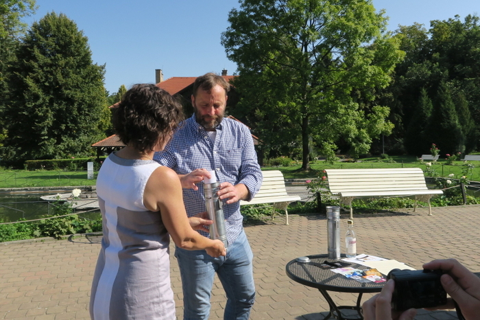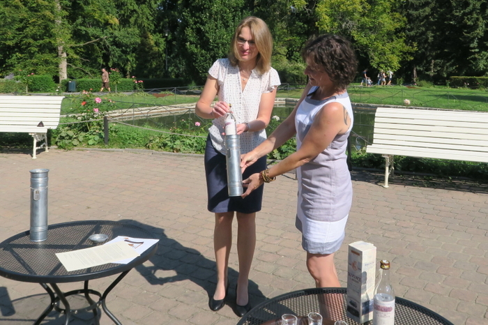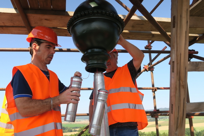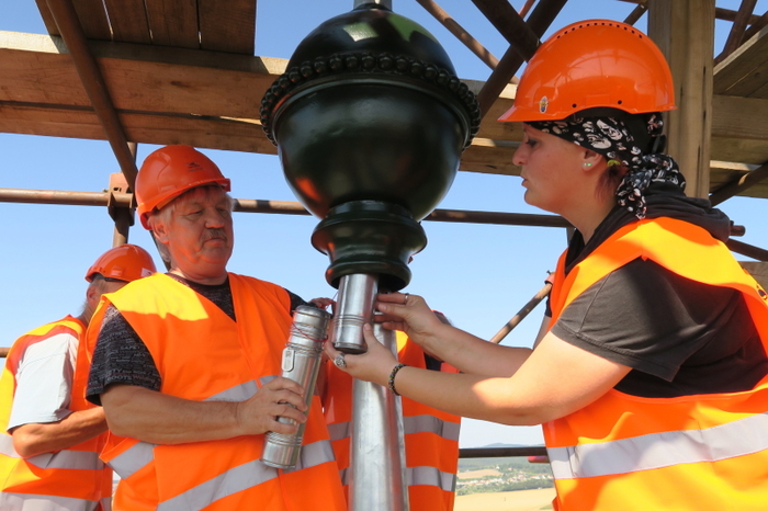 Za společnost Rudolf Jelínek a.s. předměty do časové schránky vložila vedoucí marketingu Irena Konečná. „Děkujeme zlínské zoo, že nás přizvala k této milé akci a umožnila nám vložit do schránky láhev slivovice. Pro náš region je slivovice naprosto charakteristická, je součástí našeho folklóru a tradic. My jsme pro tuto příležitost vybrali slivovici z edice k 125. výročí společnosti Rudolf Jelínek," řekla Irena Konečná. Společnost Teslice Vsetín pak do schránky umístila informace o průběhu realizace opravy a také vizitku mistrů klempířů, kteří se postarali o dokonalé uzavření obou pozinkovaných tubusů. Zástupci společnosti Teslice za doprovodu vedoucí marketingu Romany Bujáčkové pak obě dvě schránky odnesli po lešení k vrcholu zámecké věže. Poté je uložili do restaurované báně věže. Časové schránky tak budou na příští generace čekat ve výšce 40 metrů nad zemí.