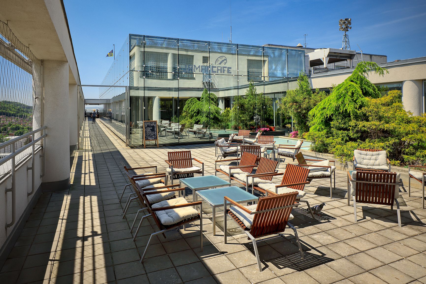 Nejkrásnější výhled na město se vám naskytne z vyhlídkové terasy v 16. patře. K dispozici jsou zde dalekohledy stejného typu, jaké najdete na amerických mrakodrapech. Její prostor zpříjemňuje zeleň s fontánou nebo bronzový model města z 50. let 20. století. Zajímavostí je také tzv. „kočka“ - speciální zařízení pro údržbu fasády budovy, která dodnes slouží svému účelu.
